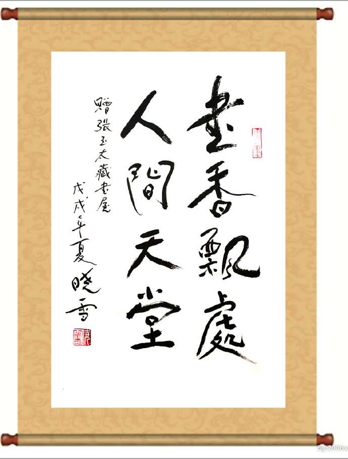 日前,云南著名詩人曉雪為我藏書屋送上一副詩聯:“書香飄處,人間天堂”,叫我驚喜莫名。詩聯掛在藏書屋內,感覺那字跡,那意境,很是明亮,暖人,真可謂:曉雪映書屋,詩意生暗香。曉雪其人實乃謙謙君子,溫文爾雅,落落大方,真誠可親,他的筆下也常有動人佳句。我有時把對他美意寫進詩行,他是云南五朵金花之一的夫婿,我對此曾大加贊譽。