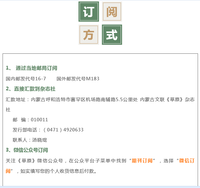 譯空間。向讀者譯介優秀的蒙語作品,包括小說、散文、詩歌。作為公益性的欄目,《草原》立足內蒙古,充分發揮地域優勢,讓更多優秀的蒙語作品被看見。