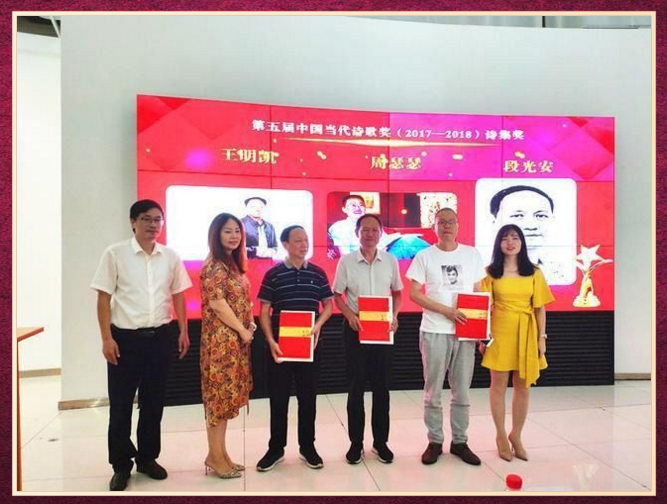 2019年8月17日,由《中國當代詩歌導讀》編輯委員會、國際詩歌翻譯研究中心、混語版《世界詩人》雜志社聯(lián)合主辦的第五屆中國當代詩歌獎(2017-2018)在重慶隆重頒獎,各大獎項名花有主、實至名歸。本屆詩歌獎最終評選出20位獲獎者。其中天津占兩席。南開大學文學院副院長、教授、博士生導師、批評家羅振亞,榮獲第五屆中國當代詩歌獎(2017-2018)批評獎;天津魯藜研究會會長、詩人段光安榮獲第五屆中國當代詩歌獎(2017-2018)詩集獎。