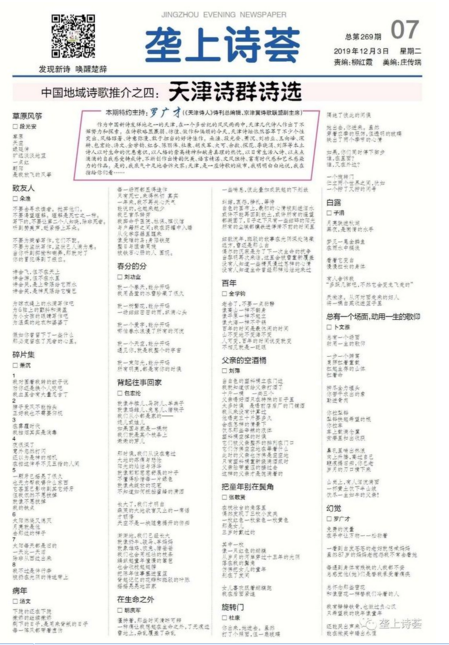 2019年12月4日,湖北《荊州晚報》壟上詩薈269期 “中國地域詩歌推薦之四:天津詩群詩選”,推出了段光安、朵漁、蕭沉、湯文、劉功業(yè)、包宏綸、胡慶軍、金學鈞、劉萍、張敬賢、杜康、子涓、卜文雅、羅廣才等14名天津本土詩人作品。《壟上詩薈》是《荊州晚報》創(chuàng)辦于2014年6月3日的一個真正屬于詩人自己的詩歌品牌欄目,已成為中國詩壇一個重要的詩歌發(fā)表陣地。
