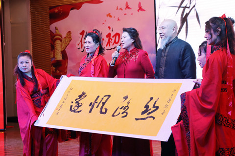 頒發(fā)2020年中國詩歌春晚(西安)優(yōu)秀書畫作品獎:國家一級美術師于振蓮、易理山水畫創(chuàng)始人張劍波、高級美術師曹京梅、西安女詩人畫家王淑惠、“太極猴壽”創(chuàng)始人李中元、周志峰、王建成、姜新建、房澤峰。他們向主辦方贈送了書畫作品。絲路行吟詩人王芳聞、古城詩人丁彩玲向陜西快樂健康協(xié)會會長郭建雄分別贈送新詩集《絲路雁影》《曲江池畔柳絲長》。