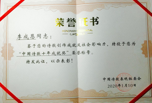 1月13日晚,“2020中國詩歌春晚頒獎盛典”在北京天橋劇場舉行,李成恩獲得“中國詩歌十年成就獎”。
