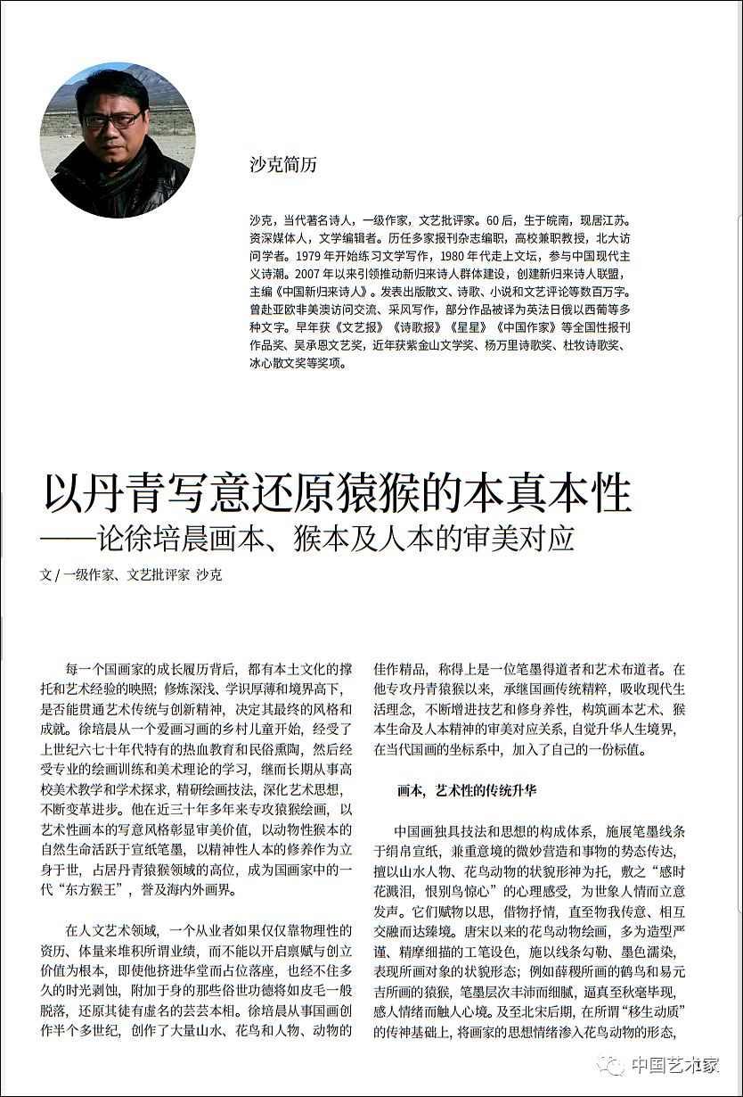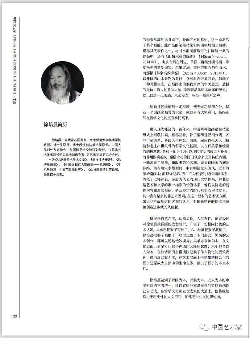 每一個國畫家的成長履歷背后,都有本土文化的撐托和藝術(shù)經(jīng)驗的映照;修煉深淺、學(xué)識厚薄和境界高下,是否能貫通藝術(shù)傳統(tǒng)與創(chuàng)新精神,決定其最終的風(fēng)格和成就。徐培晨從一個愛畫習(xí)畫的鄉(xiāng)村兒童開始,經(jīng)受了上世紀(jì)六七十年代特有的熱血教育和民俗熏陶,然后經(jīng)受專業(yè)的繪畫訓(xùn)練和美術(shù)理論的學(xué)習(xí),繼而長期從事高校美術(shù)教學(xué)和學(xué)術(shù)探求,精研繪畫技法,深化藝術(shù)思想,不斷變革進步。他在近三十多年來專攻猿猴繪畫,以藝術(shù)性畫本的寫意風(fēng)格彰顯審美價值,以動物性猴本的自然生命活躍于宣紙筆墨,以精神性人本的修養(yǎng)作為立身于世,占居丹青猿猴領(lǐng)域的高位,成為國畫家中的一代“東方猴王”,譽及海內(nèi)外畫界。