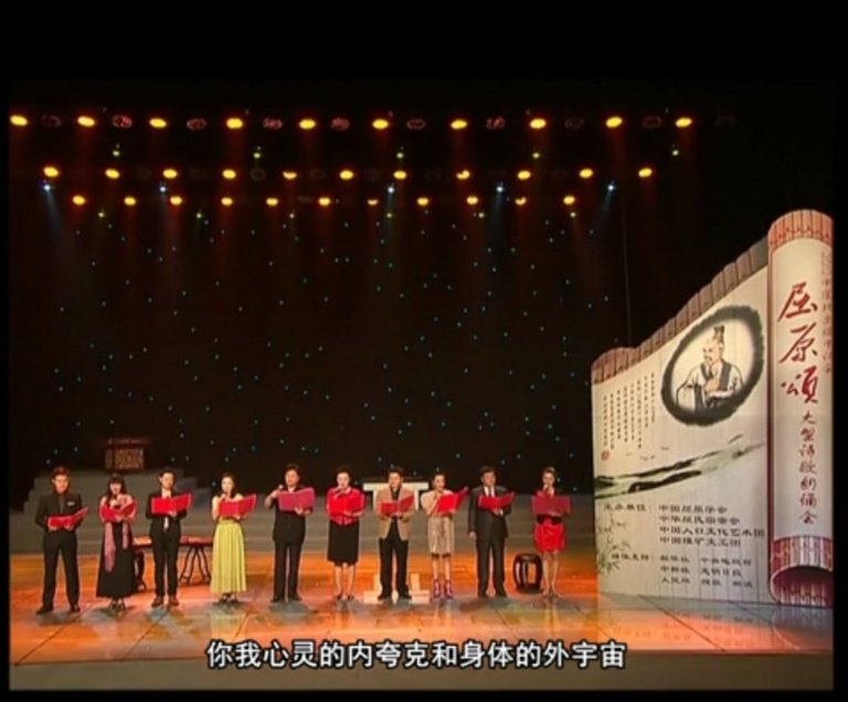 整臺(tái)晚會(huì)由長(zhǎng)詩(shī)《屈原頌》貫穿始終。八年前,詩(shī)作者屈金星沿著屈原流放的路線采風(fēng)創(chuàng)作,全詩(shī)600多行,共分九章。該詩(shī)站在人類(lèi)文明的高度解讀屈原,以全新的視角對(duì)比了屈原與李白、蘇東坡、荷馬、莎士比亞。該詩(shī)曾和北島作品一起獲全國(guó)長(zhǎng)詩(shī)獎(jiǎng)。2012年端午前夕,在京舉辦《屈原頌》大型詩(shī)歌朗誦會(huì)。