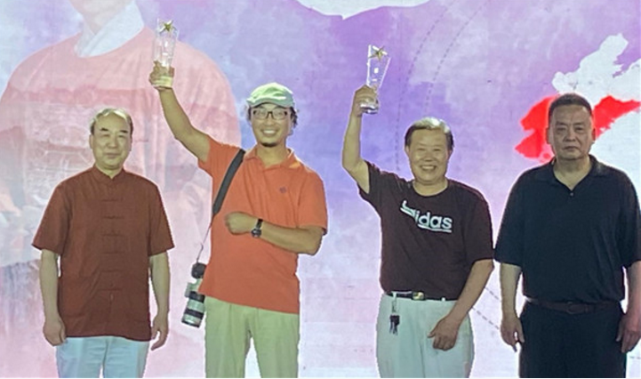 凌鼎年(左1)與冰凌(右1)為“筆墨西溪,鏡中芳華”攝影大賽的獲獎作者頒獎(2020年6月26日晚)