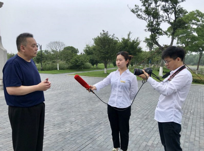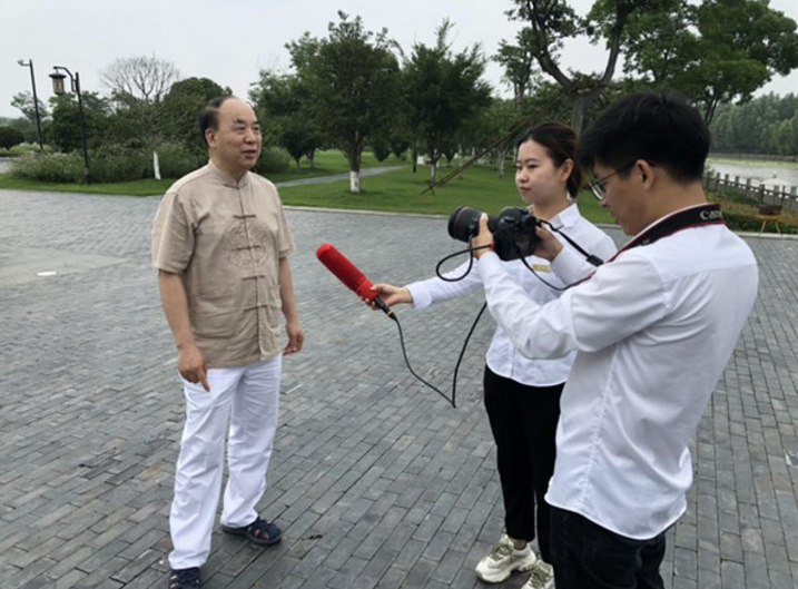 作家凌鼎年在東臺唐塔下接受當地媒體的采訪(2020年6月25日)