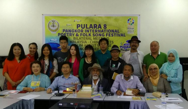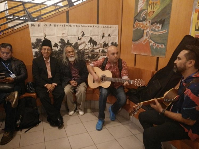 馬來西亞詩歌代表團(tuán)是由馬來西亞霹靂州州務(wù)大臣(相當(dāng)于州長)、第33屆世界詩人大會東道主贊比里博士(Dr Zambry AK),詩人小說家、馬來西亞邦咯島國際詩歌民歌節(jié)組委會主任馬里姆帶隊(duì),他們能歌善舞,非常活躍。當(dāng)他們看到肇東國畫時,全體人員坐在畫下,開始吉他彈唱。特別是在王軍先生的國畫《鶴壽松齡》前,他們彈唱了一首馬來西亞關(guān)于鶴的民歌。通過翻譯向我發(fā)出參加馬來西亞邦咯島國際詩歌民歌節(jié)的邀請。