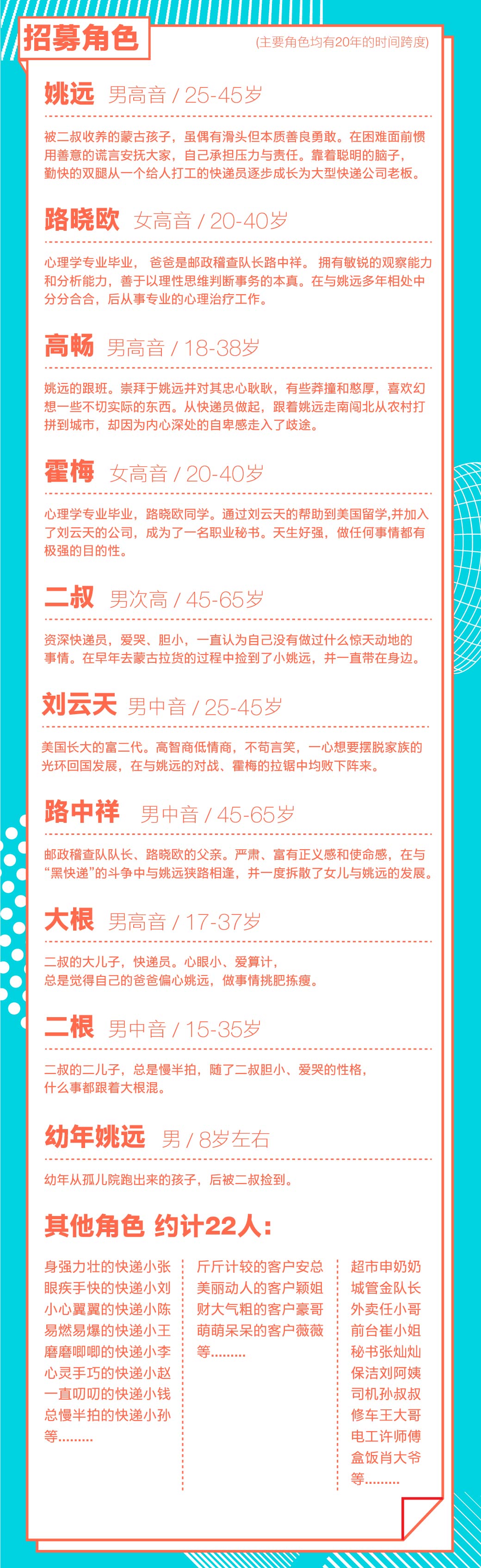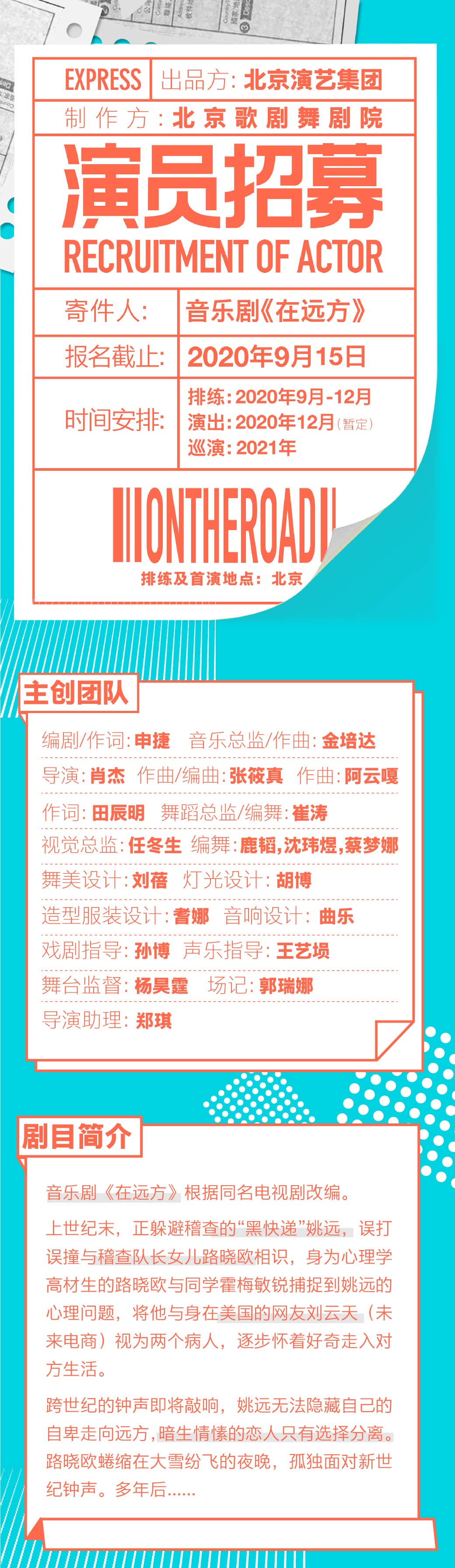 目前,該劇的演員招募已經啟動,超過30個年齡跨度達20歲的角色虛位以待,向優秀的音樂劇演員們拋出“橄欖枝”,為疫情下的演員們提供復工的機遇,期待致力于音樂劇表演的青年演員勇于挑戰自我,與角色互相成就。據悉,北京歌劇舞劇院演員阿云嘎將在劇中扮演男主人公的角色。