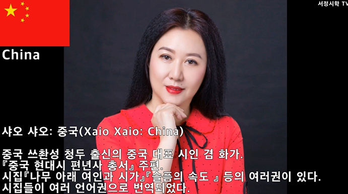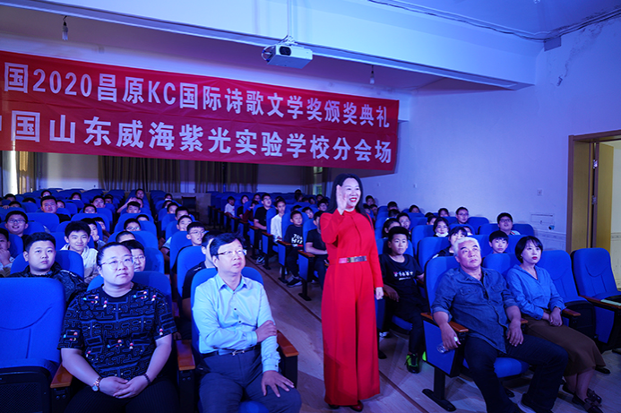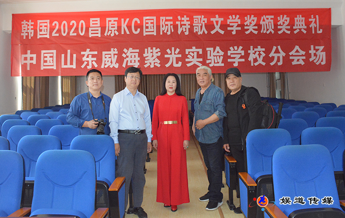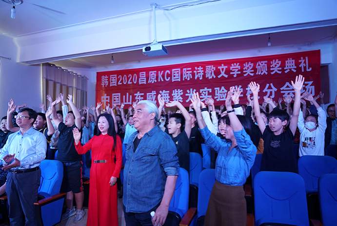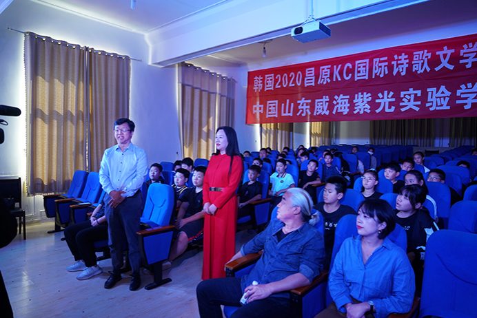 在頒獎(jiǎng)典禮的同一時(shí)間,在中國威海紫光實(shí)驗(yàn)學(xué)校的報(bào)告廳,詩人瀟瀟與正在大水泊鎮(zhèn)采訪,體驗(yàn)生活的漂泊文學(xué)的創(chuàng)始人、中國著名作家、詩人曾哲先生,紫光實(shí)驗(yàn)學(xué)校校長李凌己博士和部分師生一起,參加了在線上的視頻頒獎(jiǎng)活動(dòng)。李凌己校長宣布,把韓國給詩人瀟瀟頒獎(jiǎng)的9月27日,定為每年的校園詩歌節(jié)。