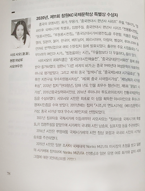 瀟瀟詩人因?yàn)槠湓娂稇n傷的速度》去年在韓國翻譯出版(樸宰雨譯),并受主辦方的邀請,到首爾舉辦出版發(fā)布紀(jì)念會(huì)。韓國的詩刊《抒情詩學(xué)》用了大量的篇幅,登載瀟瀟的韓語翻譯詩多首,以及韓國著名詩人崔東鎬教授,著名漢學(xué)家、翻譯家樸宰雨教授,與瀟瀟詩歌的對談錄,反響很好,其詩歌創(chuàng)作成果受到韓國詩壇與評論界的認(rèn)可。由此摘得本屆昌原KC國際文學(xué)獎(jiǎng)特別獎(jiǎng)。