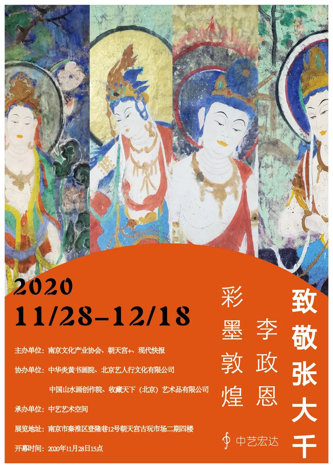致敬張大千一一李政恩彩墨敦煌展覽于2020年11月28日下午在南京中藝藝術空間隆重開幕,本次展覽集中展示了李政恩先生數十件彩墨敦煌精品力作。展覽吸引了眾多藝術家同道和藏家前來觀展。出席嘉賓有中國人民大學美學藝術研究所研究員、文旅融合專家張成源先生、中國國家畫院教學中心學術主持馬嘯先生、中國國家畫院教學中心畫家翁芳友先生、中華炎黃書畫院執行院長江成鎮先生等。
