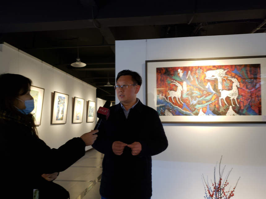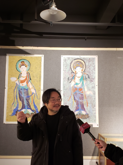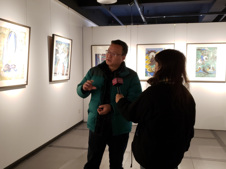中國國家畫院教學中心學術主持馬嘯先生講到:這一次我從北京專門趕到南京,參加好友李政恩先生的彩墨敦煌壁畫的展覽,非常高興。李政恩先生從事書法和繪畫的時間應該也有幾十年了。這方面投入了很多時間和精力,他是一個特別執著、特別勤奮又充滿睿智的一個藝術家。他的這次展覽,主要呈現一些彩墨敦煌畫。我們中國人一般看到的形式就是水墨畫,什么叫水墨畫?就是黑白兩色,或者再加一個顏色,再加一個灰度,黑白灰三色,這是中國人基本的色彩系統。但是,彩墨畫是比這三個顏色更豐富的一個繪畫,這個色彩主要的來源,第一個是來自古印度,古印度佛教繪畫;另一個來自于中國繪畫傳統。一個外來的,一個本土的,這兩種形式在敦煌完美的結合在一起。所以就有了敦煌壁畫這個形式,敦煌壁畫從藝術來源上,很多吸收了古希臘的傳統,但到了中國,到了新疆,到了敦煌之后,跟中國本土的,特別是從中原過去的繪畫才能有機結合,這又是一個中外結合。所以,我們平常所見的這樣一個古代藝術品,實際里頭隱藏蘊含了非常非常豐富的古代文化元素和傳統。