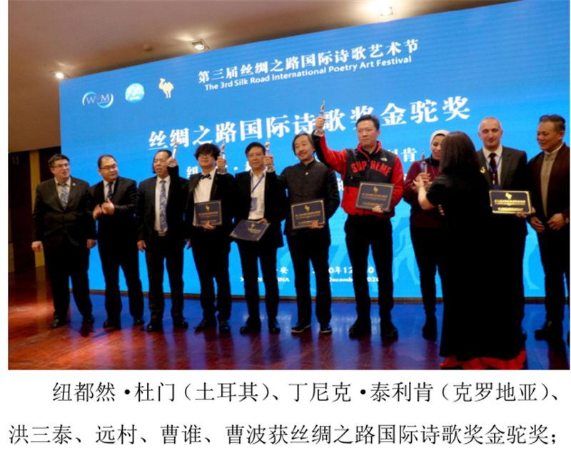 曹誰表示:“年少的時候,我曾經多次幻想這樣的場景:一個人騎著一匹馬,從長安出發,踏著絲綢之路,一直抵達羅馬,其間一定會經過伊斯坦布爾,在藍色的土耳其海峽,我們向東回望亞細亞的長安日出,我們向西眺望歐羅巴的日落。后來我開始走上寫作之路,絲綢之路也成為了我創作的一個主題。我在首屆國際寫作計劃上有幸認識了伊斯坦布爾的詩人紐都然·杜門,通過她我又認識許多世界各國的詩人,包括世界詩歌運動總協調人費爾南多·倫德。在創作抒情的詩歌、敘事的小說、戲劇的影視的同時,我開始翻譯世界各國詩人的作品,這一方面促進中外文學的交流,另一方面也讓我的作品中融入了世界各個文明的元素,完善我倡導的大詩主義理論:合一天人、合璧東西、融合古今、隨物賦形。非常感謝評委們將“金駝獎”頒發給我,這對于我的意義重大,希望這匹黃金的駱駝,將東西方文明在我的作品中緊密聯系起來。”(發言內容為節選,獲獎者系《大詩刊》主編,詩人,翻譯家)