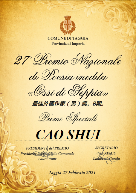 《烏賊骨》詩歌獎由意大利利古里亞大區的塔賈市議會評選,利古里亞大區的首府是著名的熱那亞城,這里也是諾貝爾文學獎得主、意大利偉大詩人歐杰尼奧·蒙塔萊的故鄉,人們通過每年的詩歌頒獎典禮紀念這位偉大的詩人。本次評獎活動,由塔賈市議會主席勞拉·卡娜(LAURA CANE)主持,從意大利各省和世界各國一百多位詩人中,選出16名獲獎詩人,其中國際詩人8名,意大利詩人8名。曹誰獲得了“最佳外國作家獎”,在外國詩人中排名第一,跟曹誰一起獲獎的還有波黑詩人埃米爾·索科洛維奇(Emir Sokolović)、西班牙詩人胡安·巴塞萊·鮑薩(Joan Josep Barceló i Bauçà)、中國詩人段廣安(DUAN GUANG’AN)、中國詩人吳投文(WU TOUWEN)、古巴女詩人阿麗莎·瑞巴爾塔(Aleisa Ribalta)、阿根廷女詩人亞歷杭德拉·米蘭達(Alejandra Miranda)、捷克女詩人賈娜·奧洛娃(Jana Orlová)。意大利各省獲獎詩人亞歷山德羅·伊茲(ALESSANDRO IZZI)、安德烈亞·特雷馬羅利(ANDREA TREMAROLI )、勞拉·桑格爾馬諾(LAURA SANGERMANO)卡米拉·蒂巴爾多(CAMILLA TIBALDO)、馬特奧·皮爾吉利(MATTEO PIERGIGLI)、洛倫佐·帕塔羅(LORENZO PATARO)阿萊斯奧·帕安諾(ALESSIO PAIANO)、尼科洛·瓦爾圖里尼(NICCOLÒ VALTULINI)。