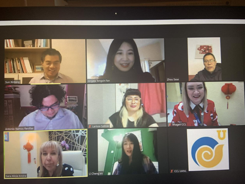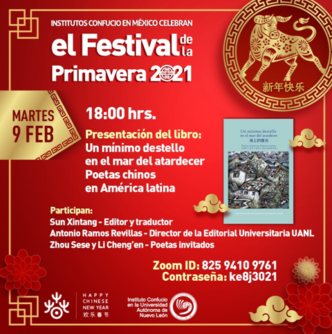 2021年2月10日,《海上的霞光》中國與拉美“云”上讀詩會舉辦,以迎接中國新年的到來。中國詩人周瑟瑟、李成恩與在智利的翻譯家孫新堂、在墨西哥的翻譯家范童心,以及墨西哥新萊昂自治大學孔子學院院長莎拉、新萊昂自治大學出版社社長安東尼奧•拉莫斯等人參加了“云”上讀詩會。活動由墨西哥新萊昂自治大學孔子學院、新萊昂自治大學出版社共同舉辦。