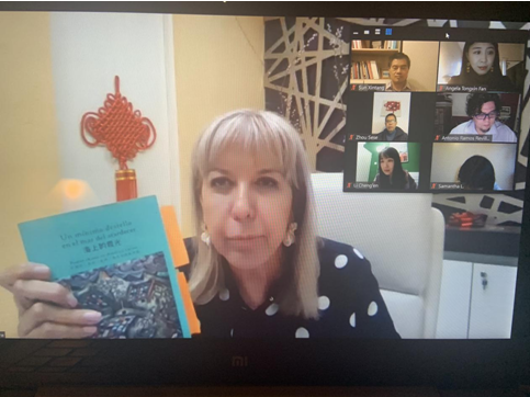 墨西哥新萊昂自治大學孔子學院院長莎拉致歡迎辭,翻譯家孫新堂主持了“云”上讀詩會,回顧了近年來中國詩人訪問拉美并與拉美詩人和讀者的交流、中國當代詩歌在拉美的譯介。新萊昂自治大學出版社社長安東尼奧•拉莫斯介紹了《海上的霞光》的出版情況。