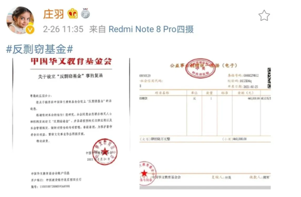 而當郭敬明賠禮致歉并承諾做出經(jīng)濟賠償,莊羽順勢提議成立“反剽竊基金會”,用以幫助原創(chuàng)作者維權(quán)。今年2月26日,隨著官方復(fù)函及第一筆匯款單的曬出,“反剽竊基金會”從口頭落到實處。
