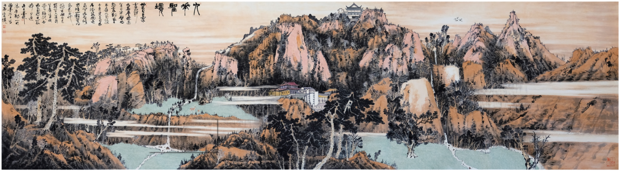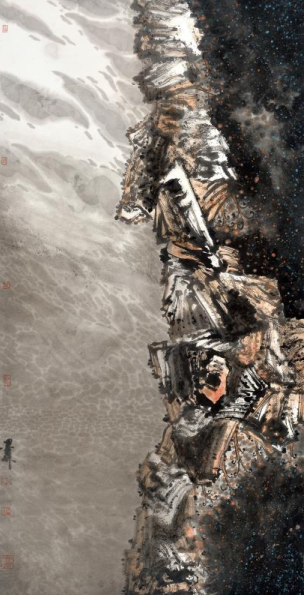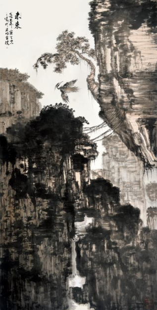 程偉杰的山水畫,畫山畫水而意不在山水,大山與江河乃是畫家胸襟與天地自然、風云幻化、歷史進程交匯融合的載體,神游太虛與弛懷山林互為表里。他的山水畫作象中有意,這個意是指畫家的主觀情感、審美意識和人格情趣。這些飽含寓意的山水便生發出磅礴之勢和汪洋恣肆之態,將古典山水中常見的孤寒寂寥、拘謹萎靡的氣息掃除殆盡,那種山川江河的生命律動與勃發,滄海桑田的嬗變與頑強,都似注入了整個民族的記憶和現實感奮。深厚華滋的畫面、拙樸無華的線條、淋漓盡致的水墨形成了大山水、大氣象、大格局的藝術風格。這種藝術風格充滿了文化自信,強調將自然物象溶入內心,釀造出不屈的民族精神。他所追求的“澄懷觀道”正是中國文化的精魂。