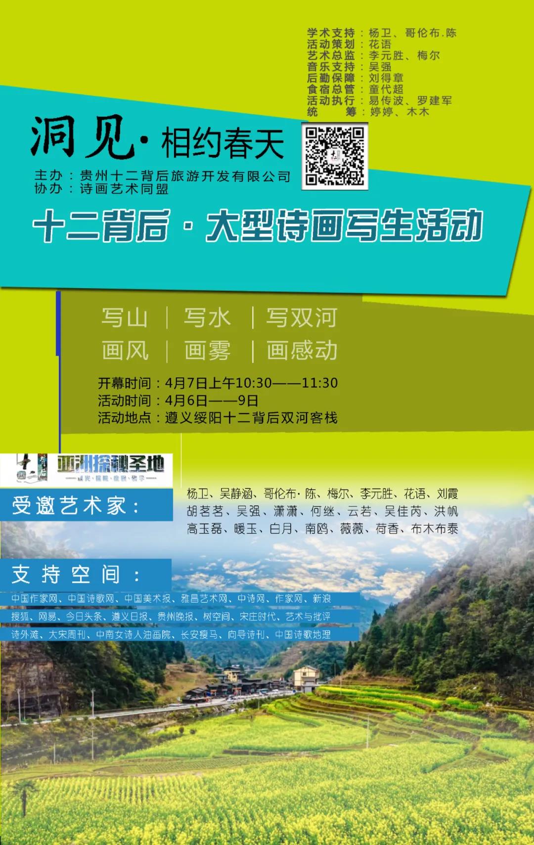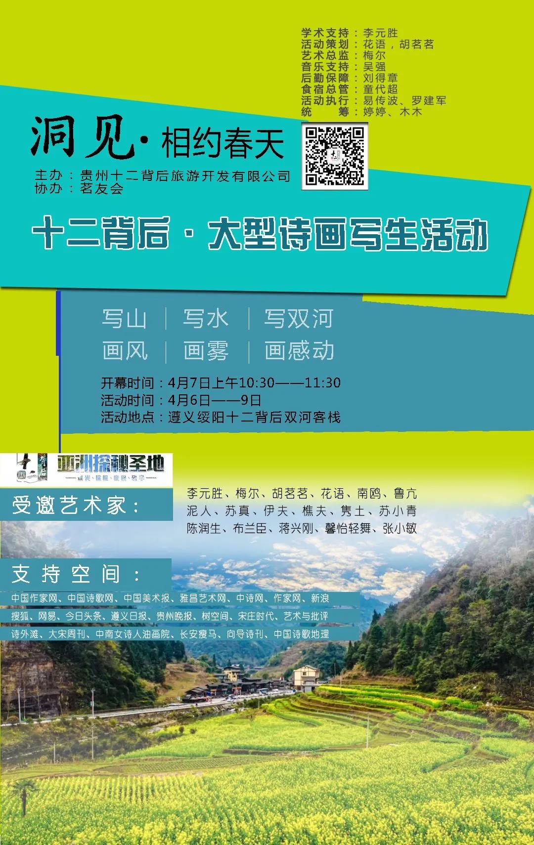 2021年4月7日,由十二背后旅游集團主辦,詩畫藝術同盟、茗友會協辦的洞見.相約春天|十二背后大型詩畫寫生活動在十二背后盛大開幕,來自全國各地的數十位詩人、畫家、藝術批評家、書法家、媒體記者齊聚遵義綏陽,用詩句和畫筆勾勒神秘的“十二背后”。