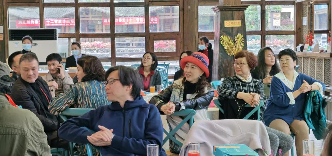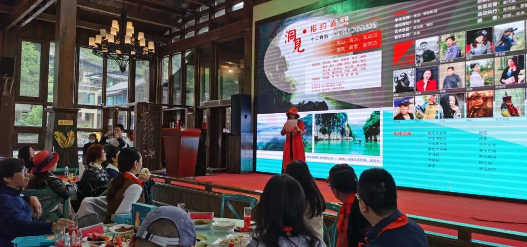 來自石家莊的詩人胡茗茗在開幕式上,對詩人梅爾以及她的團隊表達深深的感謝!她說“昨天我從陳董那里學到一個詞:風景超市。今天我們自己體會到了那種瘋狂還有敬畏。據說一個人喜愛哪片風景一定是因為骨子里有著和它相同的氣質,而且早早晚晚會來到這里,所以說我們今天在這里的相聚是有深意的,這次來到十二背后是醞釀已久的事情,也是茗友會這個詩歌群體的第三屆詩會。茗友會成立七年來。每年都會出版一本詩歌年選,每次見面會都會確定一個主題色,也是我們選的是橙色。據說白色就有四百種,那么綠色呢?橙色呢?詩人的底色呢?依然是詩歌引路。在大疫之年的背景下,愿這一抹頗具能量的色彩在這片青山綠水之間更具有穿透性與光亮。讓一種為這個不平靜的世界祈福的轟鳴,起響在整個春天,并被美傷害千百次。