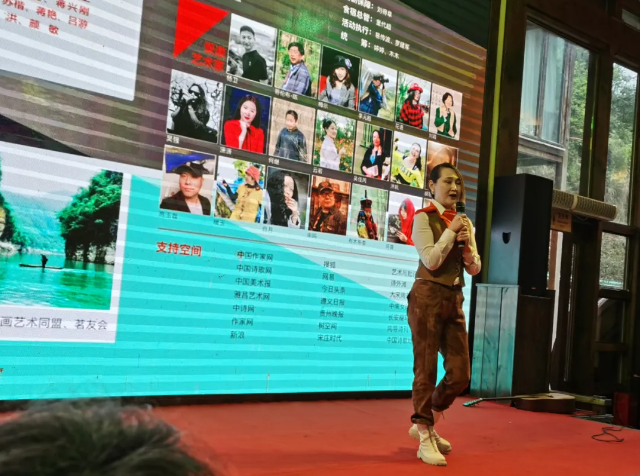 開幕式由詩人花語、瀟瀟主持,花語在歡迎辭中介紹了十二背后打造中國詩歌地理新坐標所做的一切,近幾年,隨著電影《無限深度》的拍攝,十二背后在電影的紅毯上越走越遠,成為電影拍攝網紅打卡點的優勢逐漸明顯;十二背后占地600平方公里,號稱中國旅游的最后一把匕首,一個被美傷害的地方吸引著越來越多的詩人、畫家、植物學家來此探秘寫生,把它打造成黔北高原寫生基地,是歷史的必然;十二背后是教育部指定的全國中小學研學示范基地,詩歌繪畫元素的加入,將豐富研學的內涵,也豐富十二背后的藝術多樣性,此次所請職業畫家、詩人畫家、音樂人畫家都是活躍在當下的優秀藝術家,他們扎堆聚集,強強聯手奉獻的一道藝術大餐,使人眼花繚亂,他們的到來,使十二背后的美,更加耀眼,祝福十二背后在藝術的道路上越走越遠,開出豐盛的果實!