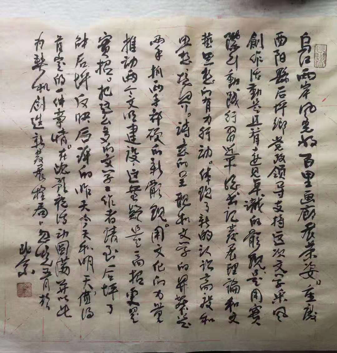 下午,在后坪鄉中心小學校會議室,采風團成員們結合自己文學創作中存在的困惑或不足,大家相互切磋,取長補短,進行了廣泛的文學創作交流。與會人員一致認為嚴格按照習近平總書記在全國思想文化工作座談會上的講話要求,堅持“雙百”方針,不斷壯大隊伍,不斷加強學習,創作出更多文學精品,推出更多文學新人,為繁榮地方文學事業,推動當地文化旅游事業發展做出更大貢獻。藝術家們也紛紛揮毫潑墨,各自展示了自己美麗的書法作品。