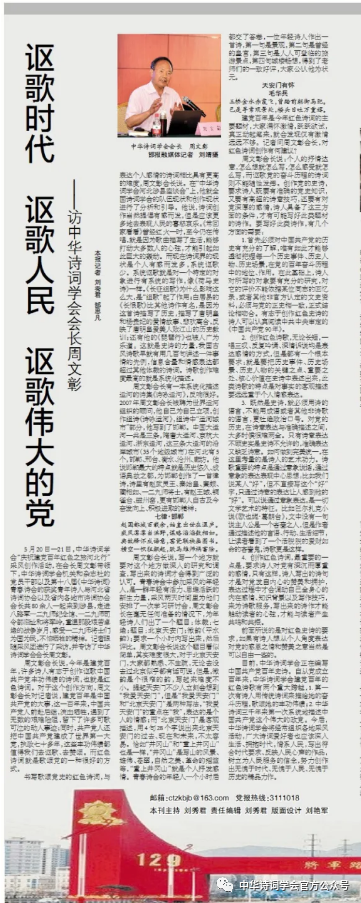 建黨百年是今年紅色詩詞的主要題材,大家滿懷激情,躍躍欲試,真正動起筆來,就會發現僅有激情遠遠不夠。記者問周文彰會長,對紅色詩詞創作有何建議?