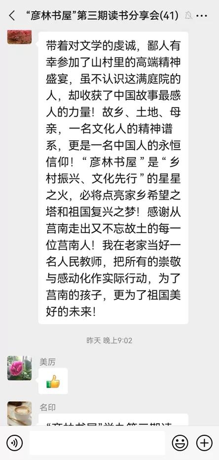 “彥林書屋”第三期讀書分享會的群聊文友留言