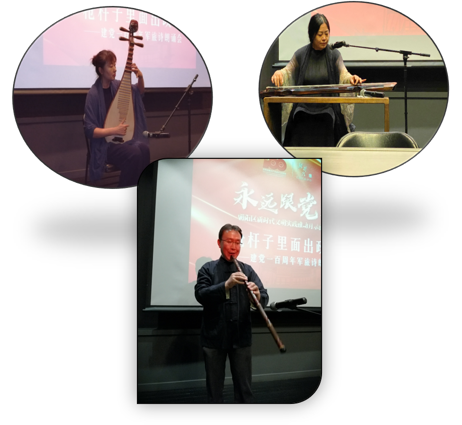 為了迎接建黨100周年,2021年6月20日晚7點, 由朝陽區文化館、《詩探索》編輯部、昆侖時代(北京)文化傳媒有限公司、作家網聯合主辦的“槍桿子里面出政權——建黨一百周年軍旅詩朗誦會”在朝陽區文化館隆重舉行。來自北京和解放軍的著名詩人及詩歌愛好者:林莽、商震、劉立云、姜念光、丁戎耕、陳亮、李點、煙驛、孫殿英等,以及朗誦和演奏藝術家:侯菊、蕭竹、孫豪、姬國勝、陳誠、李軍、隋源、劉薈、郭春華等70多人參加了此次活動。