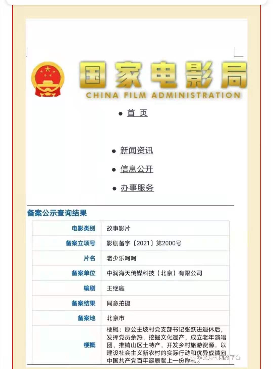 為了遵循中共中央“以科學的理論武裝人,以正確的輿論引導人,以高尚的精神塑造人,以優秀的作品鼓舞人”和“唱響主旋律,狠抓五個一工程”指示精神,《華文月刊》雜志總編、江蘇北鴻影視文化傳媒公司董事長,著名作家、編劇、資深記者王繼庭根據原公主坡村黨支部書記張躍進退休后,發揮黨員余熱,挖掘文化遺產,成立老年演唱團,推銷山區土特產,開發鄉村旅游資源,以建設社會主義新農村的典型事跡,編劇創作了一部主旋律正能量電影文學劇本《老少樂呵呵》。該片已被國家電影總局審查通過并頒發了電影拍攝許可證(影劇備字【2021】第2000號),擬定于2021年10月在江蘇徐州境內開機拍攝。