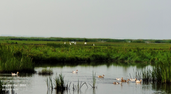 近處鴨鵝戲水,遠(yuǎn)方白鶴亮翅 。 攝影梁鳳云