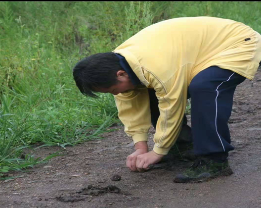 故事發(fā)生在2012年8月中旬,董配永來(lái)天華農(nóng)場(chǎng)度假的時(shí)候。一天,他晨練來(lái)到場(chǎng)部西邊養(yǎng)魚池的塘壩上,走著走著突然停下腳步,低頭看著眼前那道半尺多深還存有雨水的車轍,原來(lái)他發(fā)現(xiàn)車轍里可能埋有塑料編織袋一類的垃圾。然后就彎下腰,把手伸進(jìn)泥水里摸索起來(lái)。由于這塊編織袋在車轍里壓的太深,董配永用力一拽,把它拽斷了,剩下的一截仍然埋在泥土里。董配永沒有善罷甘休,還是在泥水里使勁往外拽。露出不大一角的編織袋裹在稀泥里,一拽一禿嚕,泥水四濺。盡管他拽得兩手兩腳都是泥水,還急得滿頭大汗,但怎么也拽不出來(lái)了。