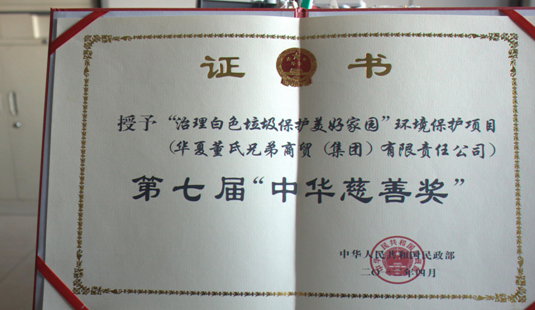 在董配永的環(huán)保世界里,類似上述這樣的平凡小事俯拾即是,不勝枚舉。但最能展示他遠(yuǎn)大思維、博大胸襟和巨大貢獻(xiàn)的,首推在綏棱縣開展的“治理白色污染,保護(hù)美好家園”行動(dòng)。該行動(dòng)榮獲第七屆“中華慈善獎(jiǎng)”,被譽(yù)為消除白色污染、保護(hù)土地清潔、造福人居環(huán)境的有益之舉。