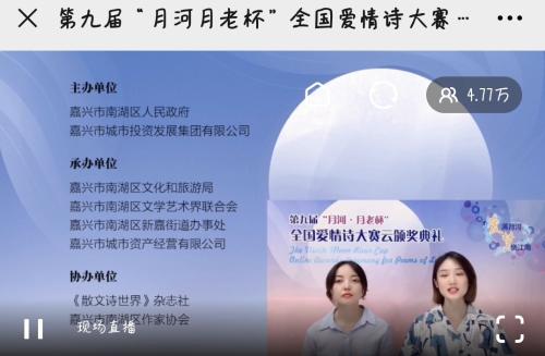 受疫情影響,本次“月河·月老杯”全國愛情詩大賽頒獎典禮于8月14日以云頒獎的形式舉行。在南湖區人民政府、嘉城集團領導和成千上萬觀眾的共同見證下,舉行生動活潑、浪漫甜蜜、饒有情趣的云頒獎。俄羅斯知名女詩人娜斯佳,中國金話筒獎得主、浙江省朗誦協會會長劉忠虎,通過云上與觀眾面對面,朗誦大賽的得獎作品,將美妙甜蜜的“月河月老”之聲,以愛的名義,傳至世界的每個地方。