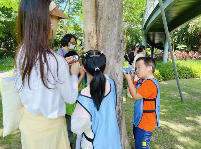 2021年8月,福田區(qū)兒童圖書館香蜜分館開展“森林自然課程”戶外活動(dòng),帶領(lǐng)小讀者以香蜜公園為環(huán)境依托,一起聆聽樹的秘密語言,用聽診器聽樹的聲音,尺子量樹的維度,顯微鏡看樹的表皮,鋸開樹木并在上面描繪心里的世界。